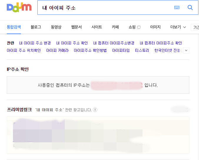 내 아이피 주소를 확인하는 가장 간단한 방법은 포탈 검색창에 [내 아이피 주소]라고 검색을 하는 방법입니다. 우리는 티스토리이니 Daum 검색창에 검색을 해줍니다. 네*버 검색창에 동일한 작업을 하여도 결과 값은 똑같았습니다. 정말 간단하죠? 사실 저도 포스팅을 하면서 알게 되었습니다.