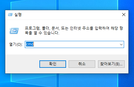 내 아이피 주소를 확인하는 또 다른 방법은 명령 프롬프트 실행창에서 확인하는 방법입니다. 가끔 무엇인가 허세가 필요할때 한 번씩 해봄직한 방법입니다. 먼저 실행창을 띄웁니다. [윈도우키 + R]이 실행창이고 여기에 <cmd>를 입력한후 엔터를 쳐줍니다.