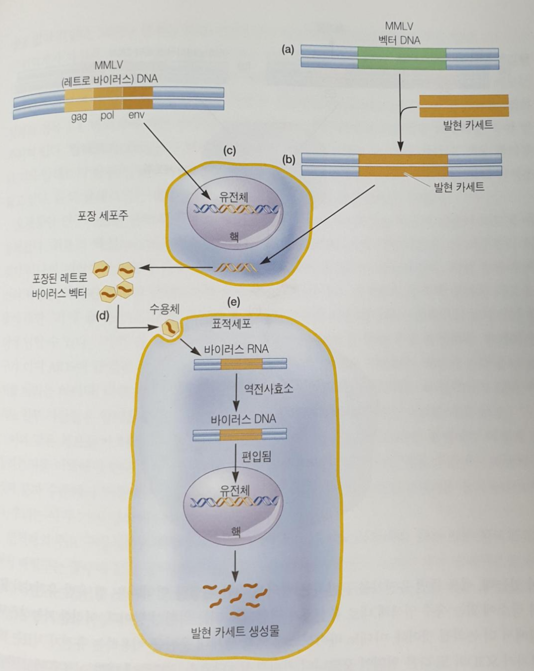 이와 같은 통제가 필요한 것은 돌연변이 바이러스가 다른 조직으로 빠져나가지 않도록 하는 데 필요합니다. 이 포장 세포주에서 돌연변이 바이러스 입자를 모아, SCID의 골수세포와 같은 표적세포를 감염시키는 데 사용합니다. MMLV는 레트로 바이러스이므로 표적세포를 감염시켜서 그 세포 내에서 자신의 RNA 유전체에서 DNA를 만들어냅니다. 그러면 이 DNA는 프로모터 및 ADA 유전자와 함께 숙주 유전체 내로 편입될 수 있게 됩니다. 수집된 표적세포들이 이러한 방법으로 형질전환되면, 이 세포들은 ADA를 생산할 것입니다. 그러면 이 세포들은 다시 환자에게 투여하면 됩니다.