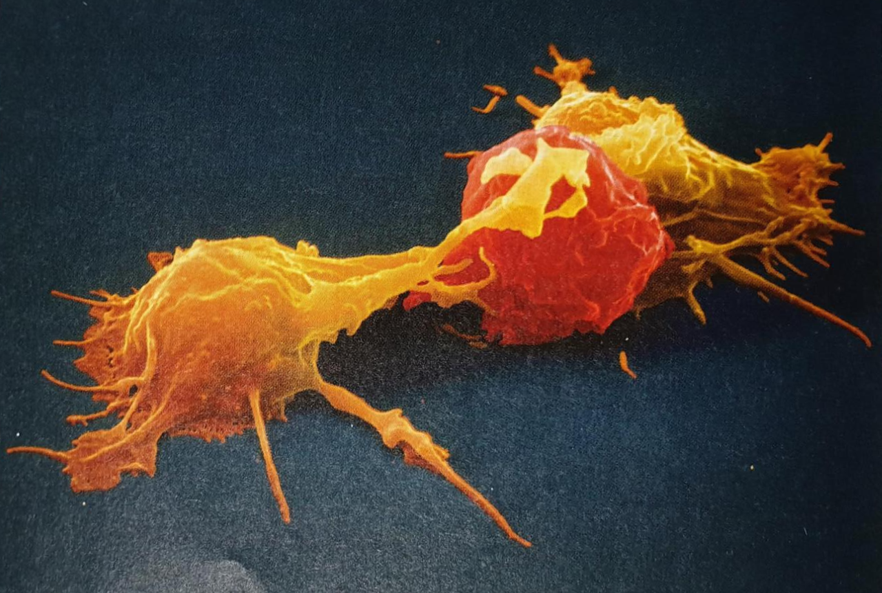 선천성 면역계의 또 다른 중요한 세포 유형은 자연 살생 세포입니다. 이것은 림프구라고 불리는 백혈구 부류에 속하는데, 그 이유는 이 NK세포가 림프계 줄기세포라 불리는 한 유형의 줄기세포에서 유래되었기 때문입니다. NK 세포는 바이러스에 감염된 세포나 암세포를 죽이며, 사이토카인을 분비하여 다른 세포를 불러냅니다. NK 세포는 어느 정도까지는 수지상세포와 같이 일하기도 합니다. 감염이 경미하면, 나머지 면역계가 활성화되기 전에 NK 세포는 감염된 수지상세포를 죽여서 마무리하기도 합니다. 따라서 NK 세포는 후천성 면역계가 활성화될 필요가 있는지 또는 없는지의 여부를 결정하는 것을 돕습니다. NK 세포는 암과 싸우는 데에도 중요합니다. NK 세포는 항바이러스 당단백질인 인터페론에 의해 자극됩니다. 인터페론은 첫 번째 암 치료제의 하나로 채택되었으며, 사람들이 사용할 수 있도록 클로닝 하여 발현된 첫 번째 단백질입니다.
