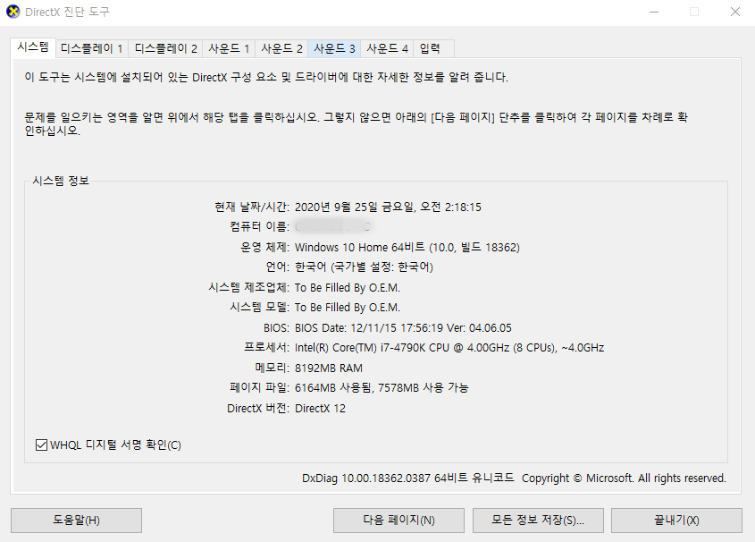 해당 윈도우 명령어는 내 컴퓨터의 사양과 사운드 테스트 등의 전반적인 정보들을 확인할 수 있는 명령어입니다. 그래픽 카드와 사운드 카드의 정상작동 여부 테스트를 할 때 자주 이용이 되며, Window의 빌드 버전 등의 확인이 필요할 때 매우 유용하게 사용할 수 있습니다. [dxdiag]를 입력하면 기능이 활성화됩니다.
