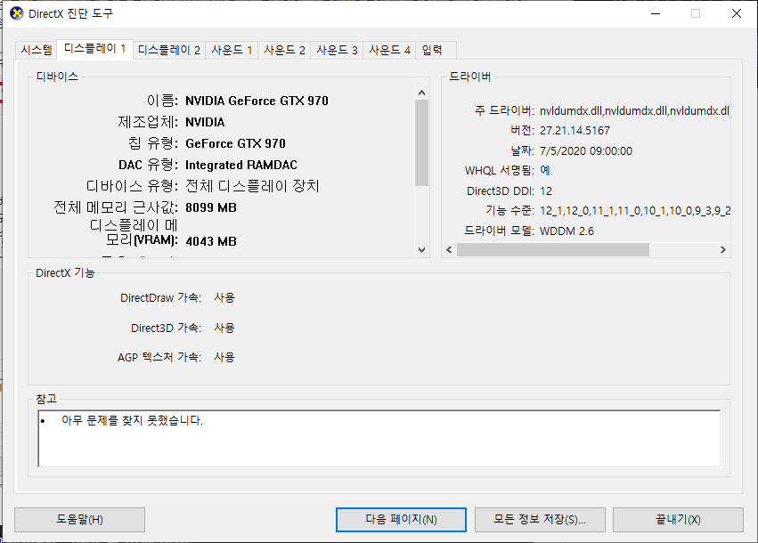 진단 도구가 실행이 된다면 정보창이 팝업이 되는데, 상단 목록에서 [디스플레이] 탭에서 그래픽카드의 사양을 확인할 수 있습니다. 제 경우 모니터를 2대 사용하고 있기에 디스플레이가 2개로 표시가 되지만 단일 모니터를 사용할 시에는 한 칸의 탭만이 나타나게 됩니다.