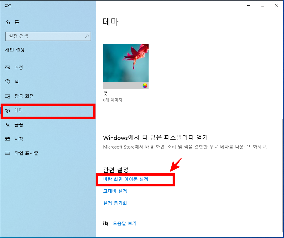 개인 설정에 들어오신 후 테마 메뉴를 선택하신 후 하단에 있는 [바탕화면 아이콘 설정]을 클릭해 줍니다.