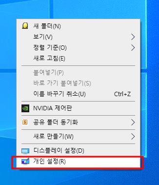 설정의 시작은 [마우스 오른클릭 + 개인 설정(R)] 탭을 사용합니다.