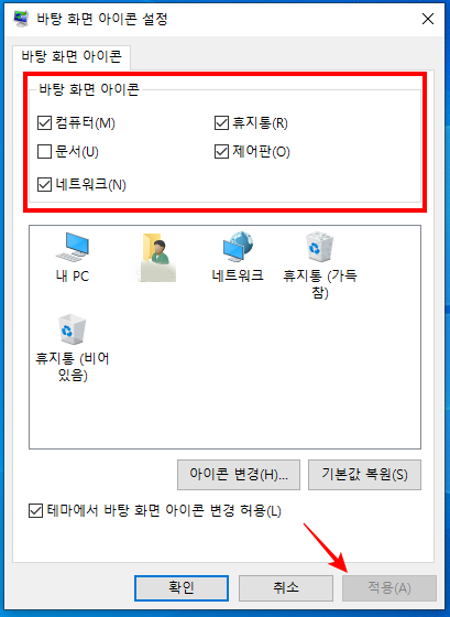 화면과 같이 <바탕 화면 아이콘 설정> 창이 나타나게 됩니다. 컴퓨터, 휴지통, 문서, 제어판, 네트워크 등의 윈도우10 초기 기본 아이콘들을 밖으로 꺼내 놓을 수가 있습니다. 추가로 아이콘 변경을 클릭하여 기존 이미지 대신 새로운 이미지로 아이콘을 교체할 수도 있으니 참고하시면 좋을 것 같습니다. 이상 쥬르스였습니다.